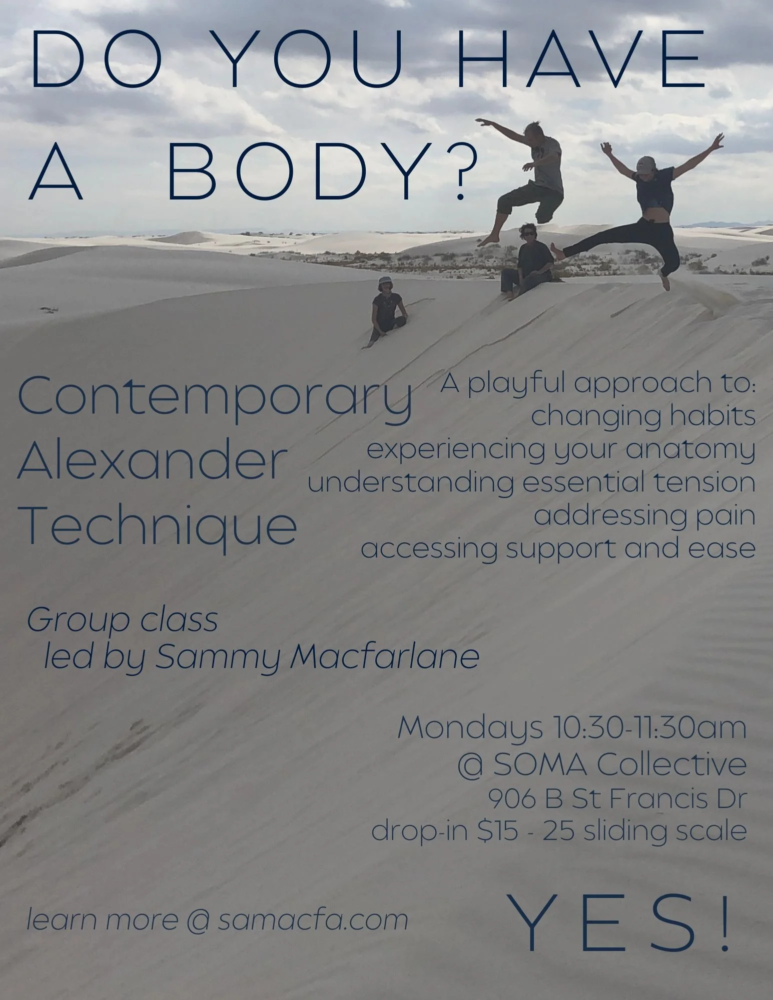 A 9 month, in-person study group, based in Santa Fe, NM, taught by Samantha Macfarlane and Robyn Avalon. This course is designed to offer you personalized somatic study in the quality of YOU.