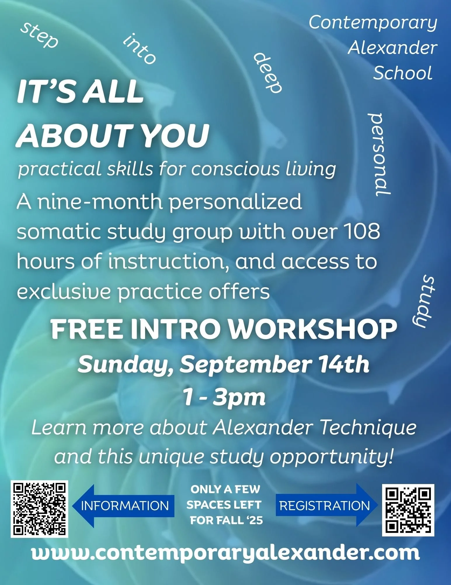 Free Intro Workshop! Sunday, September 14th1-3pm Learn about a contemporary approach to the Alexander Technique. Notice habits, relieve tension, experience fresh choice and joy!